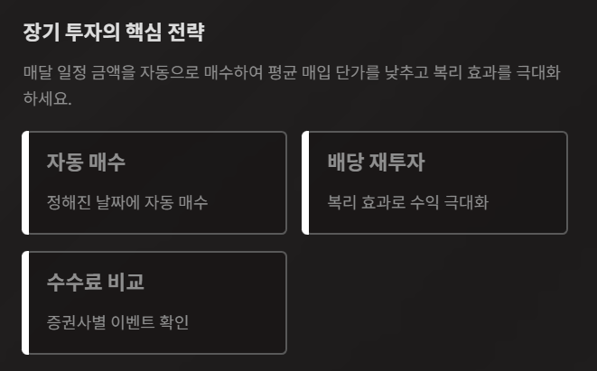 - 소액 적립식 투자 가능: 매달 일정 금액 자동 매수 → 장기 투자 전략과 시너지