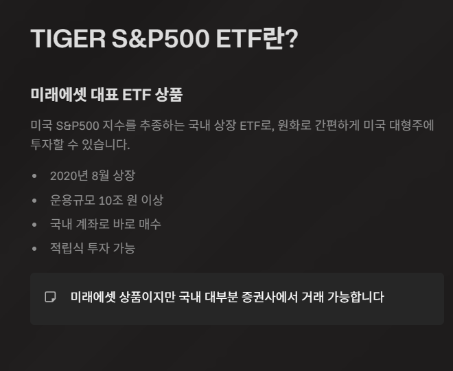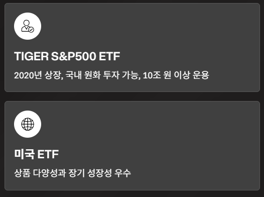 특히 TIGER S&P500 ETF는 미국 S&P500 지수를 추종하여 국내 투자자가 원화로 간편하게 미국 대형주에 투자할 수 있는 상품입니다.