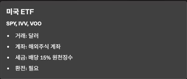 미국 ETF는 SPY, IVV, VOO처럼 해외 상장 상품을 직접 매수할 때 필요합니다.