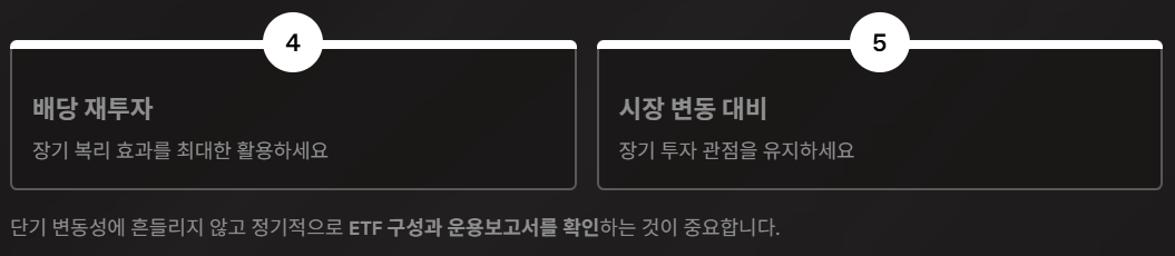 - 배당 재투자와 장기 전략을 활용하면 안정적인 수익 기대 가능