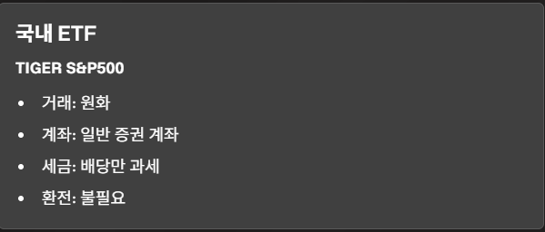 | 구분 | Tiger S&P 500 ETF(국내) | 미국 ETF (SPY , IVV, VOO) |
