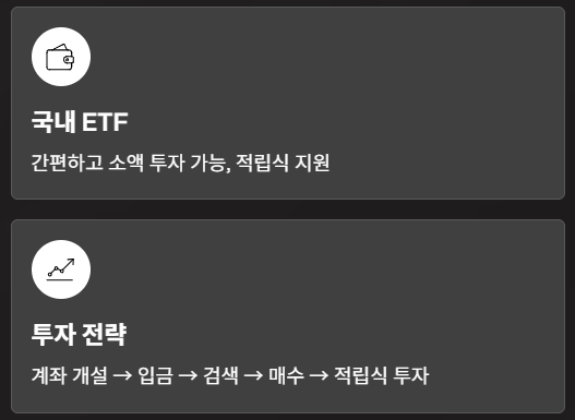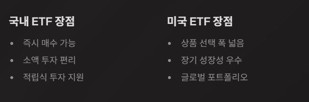 | 장점 | 간편, 소액 투자 가능 | 글로벌 ETF 폭넓은 선택, 장기 투자 유리 |