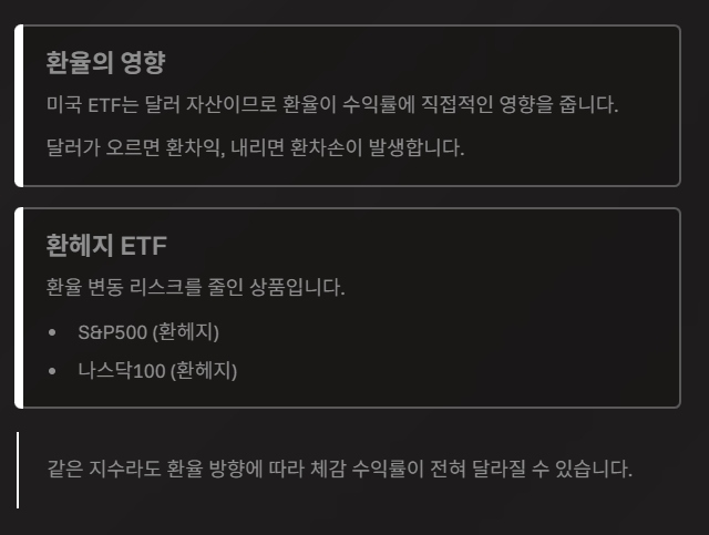특히 미국 ETF는 달러 자산이라 환율이 수익률에 직접적인 영향을 준다. 그래서 요즘은 환헤지 ETF도 많이 나온다.