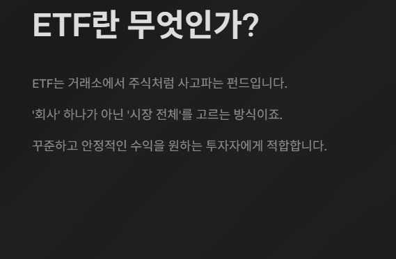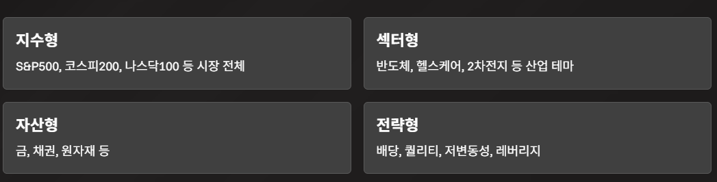 주식 투자처럼 ‘회사’ 하나를 고르는 게 아니라, ‘시장/섹터/테마’를 고르는 방식이라 꾸준하고 안정적인 수익을 원하는 사람에게 적합하다.