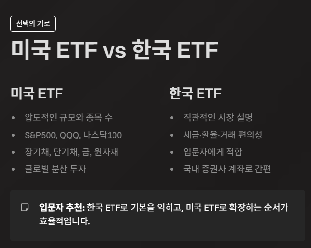 반면 한국 ETF는 국내 시장 설명이 더 직관적이고, 세금·환율·거래 편의성이 좋다.