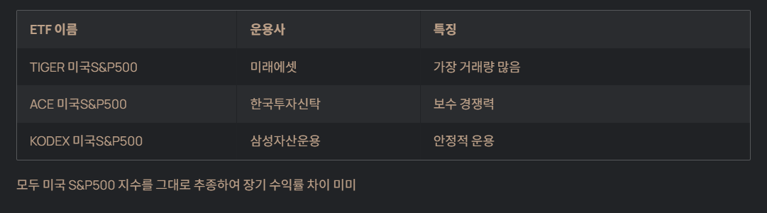 현재 국내 증시에 상장된 대표적인 미국 S&P500 지수 추종 ETF는 다음과 같습니다.