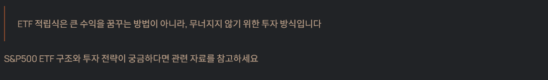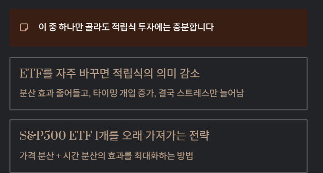 그래서 S&P500 ETF 1개를 정하고 오래 가져가는 전략이 적립식 투자에는 가장 잘 맞습니다.