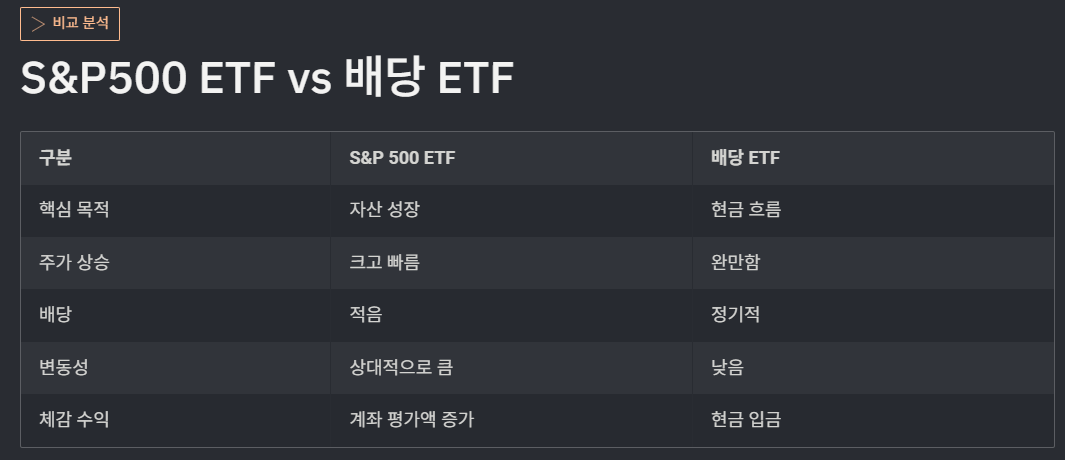 | 구분 | S&P 500 ETF | 배당 ETF |