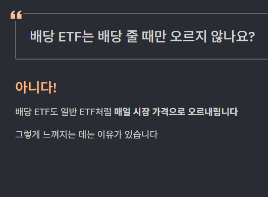 가격이 내려가 체감이 적다 보니 “배당 줄 때만 오르는 ETF”처럼 느껴진다.