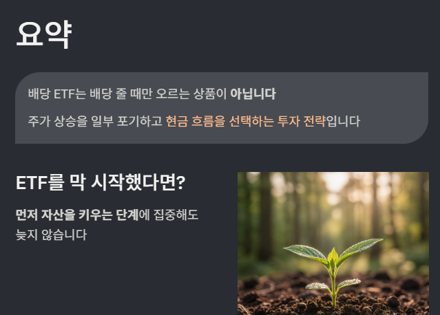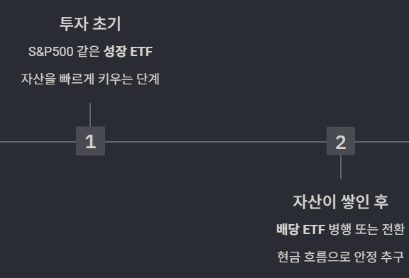 ✔ 자산이 쌓인 후 → 배당 ETF 병행 또는 전환