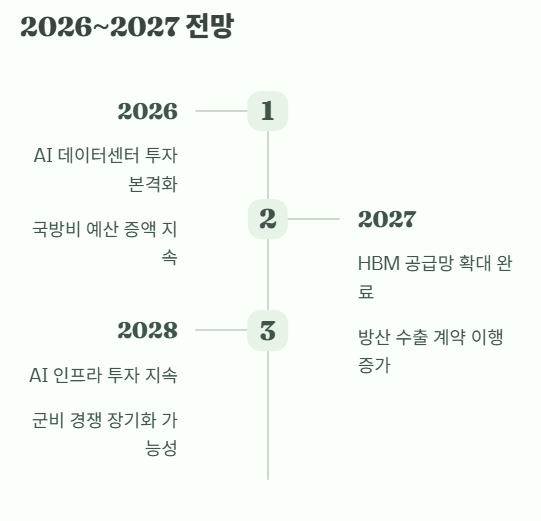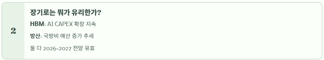 HBM은 AI CAPEX 확장, 방산은 국방비 예산 증가가 핵심이라 둘 다 2026~2027 전망이 유효하다는 분석이 많다.