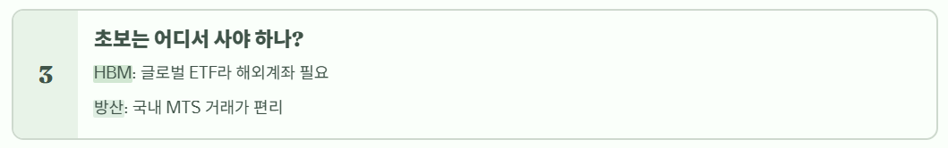 HBM은 글로벌 ETF라 해외계좌 필요, 방산은 국내 MTS 거래가 편하다.