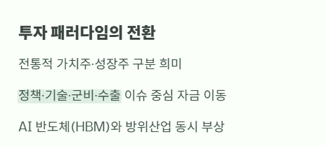 전통적인 가치주·성장주 구분이 희미해지면서 정책·기술·군비·수출같은 이슈 중심으로 자금이 이동하고 있다는 점도 특징이다.