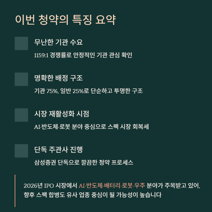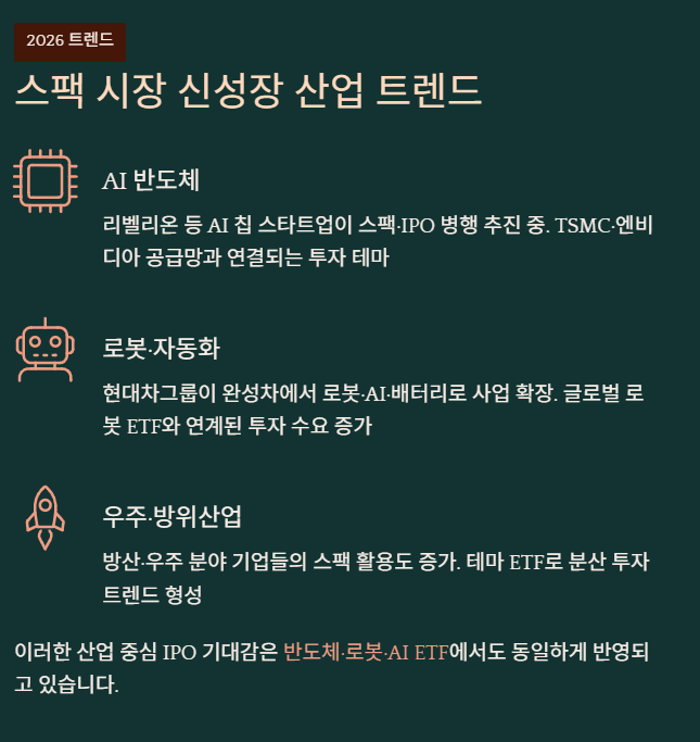 2026년 IPO 시장에서 AI·반도체·배터리·로봇·우주 분야가 주목받고 있어, 향후 스팩 합병 딜도 유사 업종 중심이 될 가능성이 있습니다.