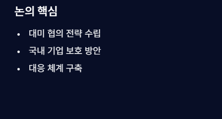 - 논의 내용: 향후 대미 협의 전략, 국내 기업 보호 방안, 대응 체계 구축