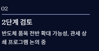 - 2단계 조치: 향후 반도체 관련 품목 전반으로 확대 가능, 기업 대미 투자와 연계한 관세 상쇄 프로그램(Tariff Offset Program) 논의 중