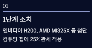 - 1단계 조치: 엔비디아 H200, AMD MI325X 등 일부 첨단 컴퓨팅 칩에만 제한적으로 25% 관세 적용