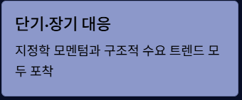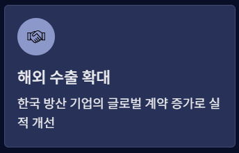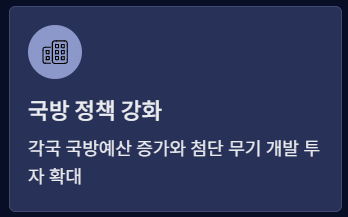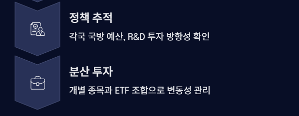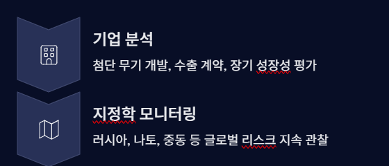 - 방산 수요 증가 → 글로벌 방위산업에 직접적 투자 기회