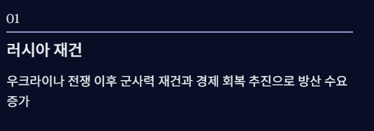 국내 기업들의 첨단 무기 개발과 해외 수출 전략, 그리고 러시아 재건, 그린란드·나토 문제, 중동 불안 등 글로벌 리스크를 종합적으로 고려해야 합니다.