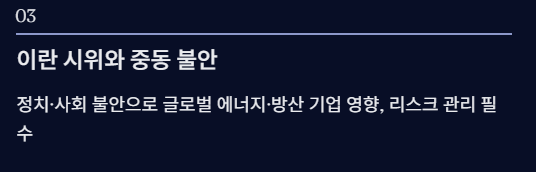 - 중동 내 정치·사회 불안 → 글로벌 에너지·방산 관련 기업 영향