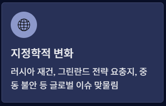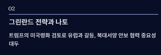 - 유럽(덴마크)과 갈등 → 북대서양 안보 및 방산 협력 중요성 증가