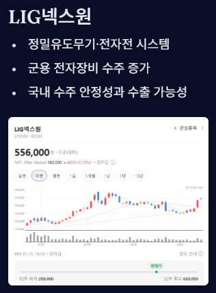 - 투자 포인트: 국내 국방 수주 안정성과 글로벌 수출 가능성