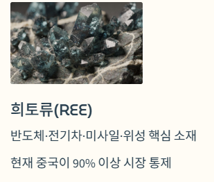 희토류는 반도체·전기차·미사일·레이더·위성·배터리에 모두 들어가기 때문에 중국이 90% 이상 시장을 사실상 통제하고 있다.