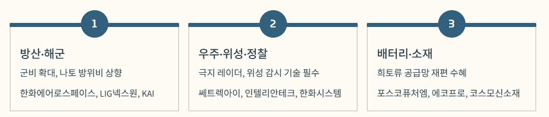 특히 방산과 위성은 군사적 필요성이 높고, 조선은 북극 항로를 고려하면 LNG선·특수선 수요가 늘어날 여지가 있다.