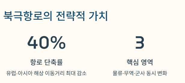항로가 열리면 해상 이동 거리가 유럽-아시아 기준 최대 40% 단축되기 때문에 물류·무역·군사 모두 달라진다.
