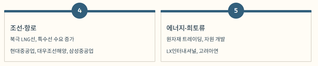 북극 전략과 자원 공급망 변화는 다음 산업이 수혜를 기대할 수 있다.