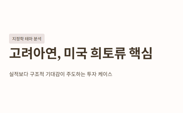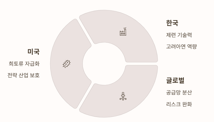 즉 고려아연이 미국에서 희토류를 생산+제련+공급하게 된다면 한국 기업의 역할이 지정학적으로 확장되는 셈이다.