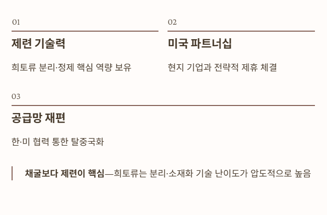 희토류는 ‘채굴’보다 ‘제련·분리·소재화’가 훨씬 기술 난이도가 높다.