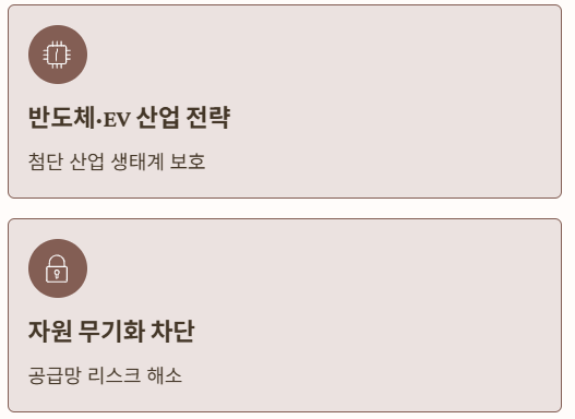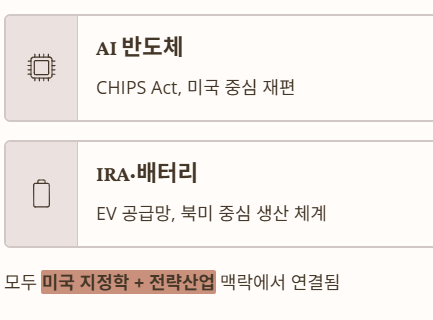 이 전략은 반도체(IRA·CHIPS Act), 배터리, 태양광, 방산에서 이미 진행 중이다.