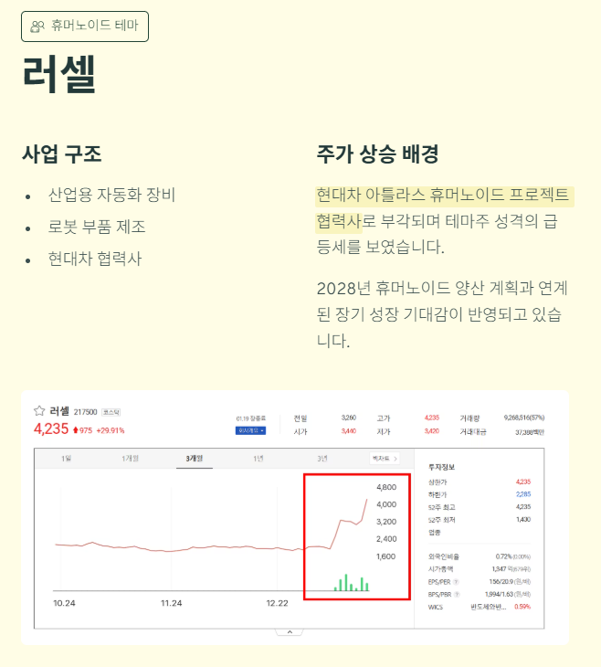 | 러셀 | +27% | 현대차 휴머노이드 아틀라스 양산 계획 연계, 핵심 협력사 부각 |