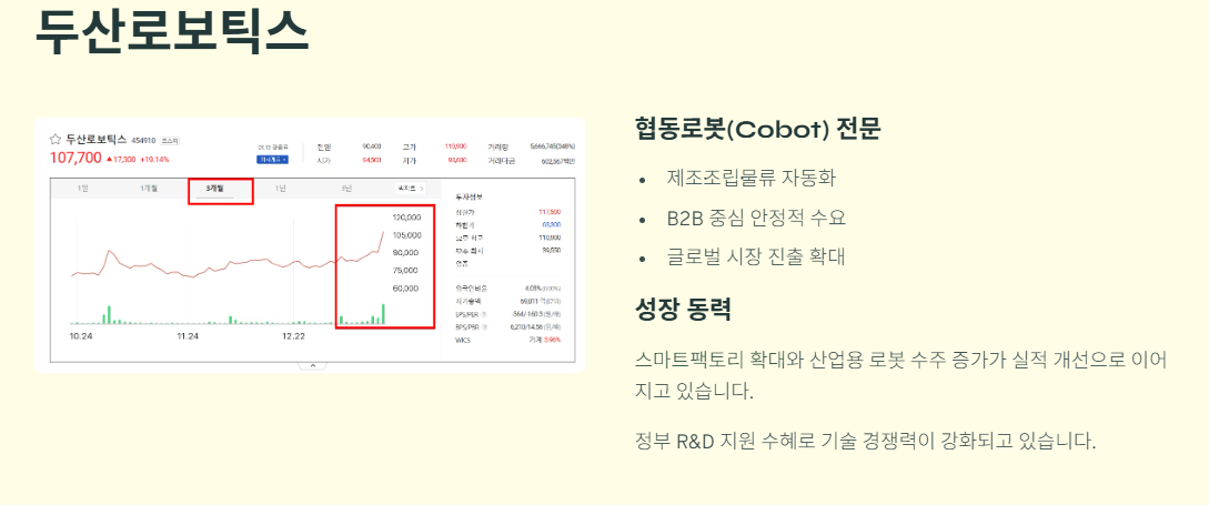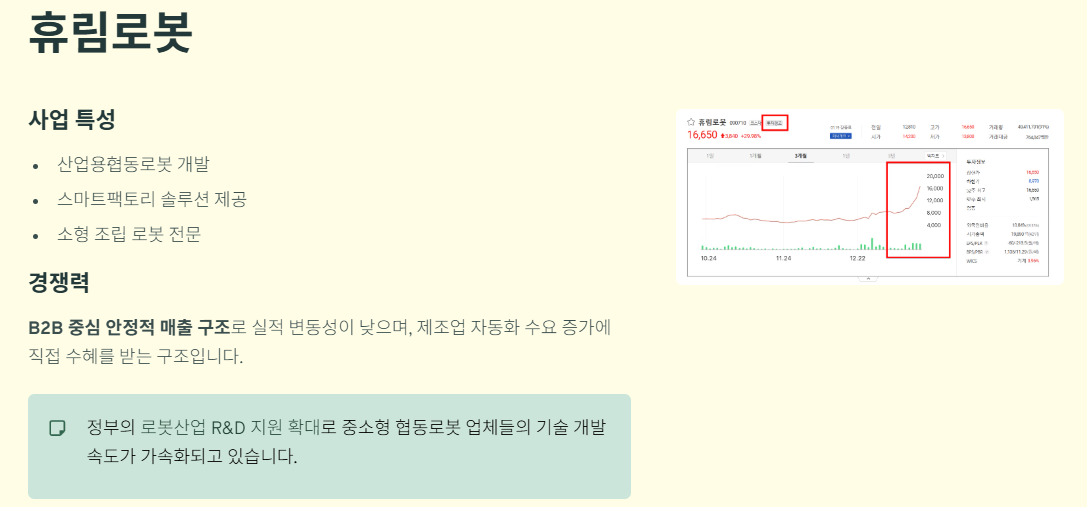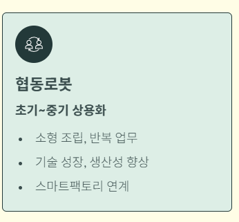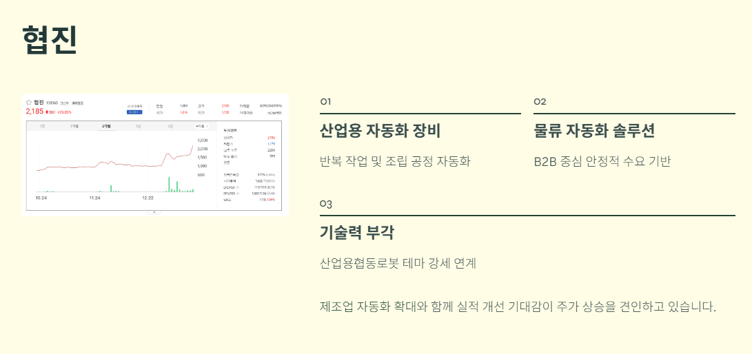 | 투자 포인트 | 실적 기반, 정책·R&D 수혜 | 기술 성장, 생산성 향상, 스마트팩토리 연계 | 미래 성장 모멘텀, AI+휴머노이드 |