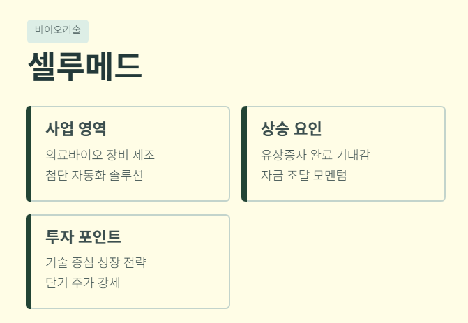 - 특징: 기술 중심 기업, 유상증자 완료 기대감으로 단기 주가 강세
