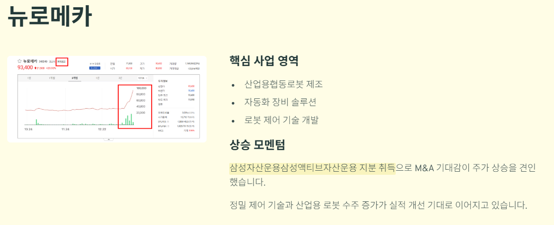 - 최근 모멘텀: 산업용·협동로봇 테마 강세와 연계, 기술력 부각