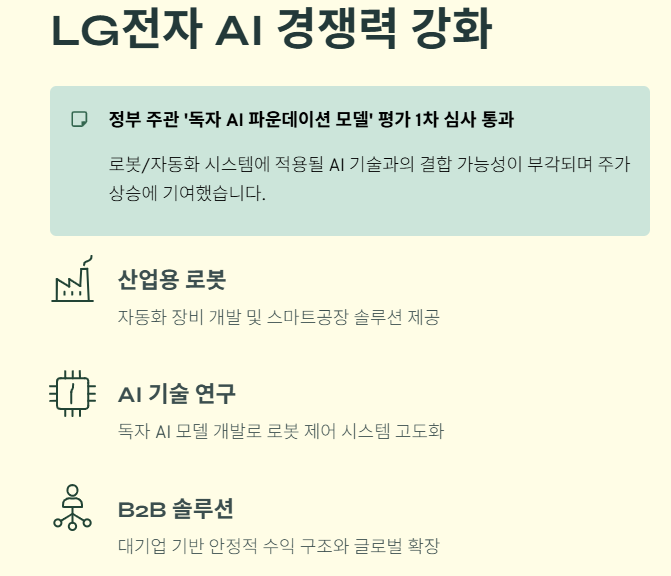 | LG전자 | +3~5% | 자동화 장비 및 로봇 기술 연구 강화, B2B 공급 확대 |