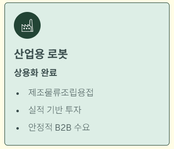 - 특징: 공장 자동화 중심, 휴머노이드 연구·개발로 장기 성장 모멘텀