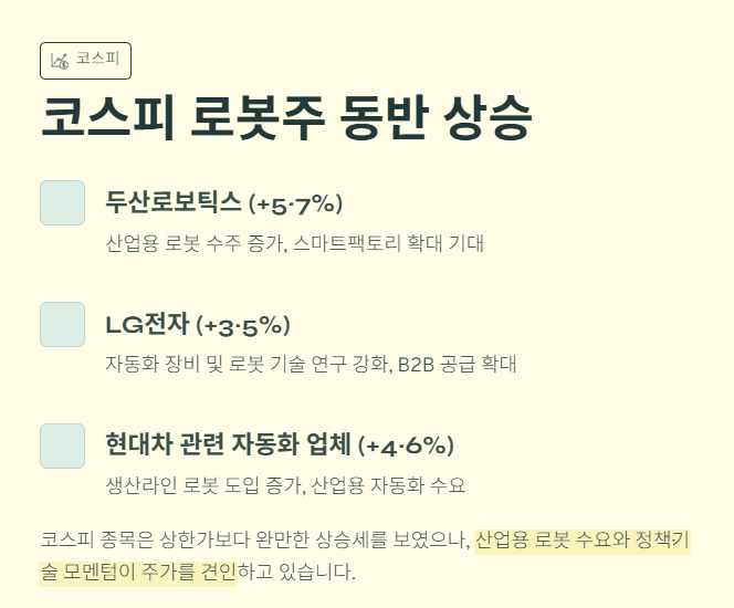 | 두산로보틱스 | +5~7% | 산업용 로봇 수주 증가, 스마트팩토리 확대 기대 |