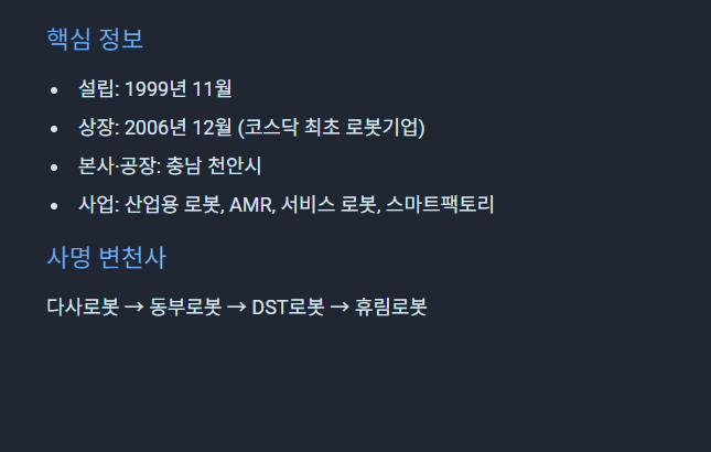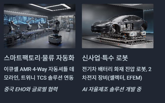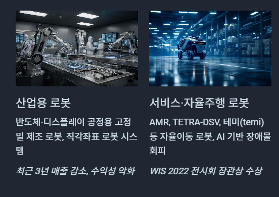 - 주요 제품: 산업용 제조 로봇, AMR(자율이동로봇), 서비스 로봇, 스마트팩토리 솔루션
