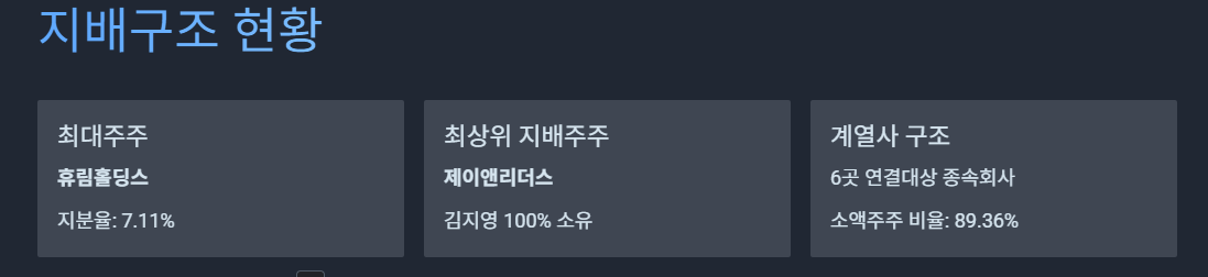 - 최상위 지배주주: 제이앤리더스 (김지영 100% 소유)