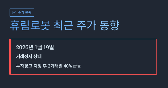 2026년 1월 20일, 휴림로봇은 투자경고종목 지정 이후 2거래일 동안 주가가 40% 이상 급등하면서 한국거래소로부터 1일간 매매거래 정지 조치를 받았습니다.