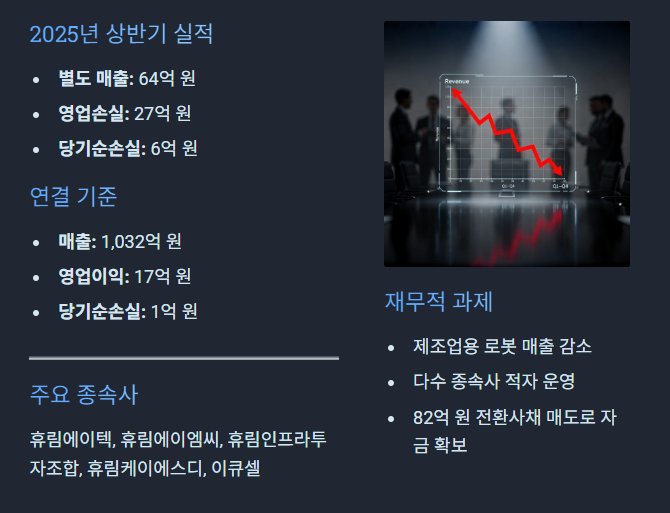 - 주요 종속사: 휴림에이텍, 휴림에이엠씨, 휴림인프라투자조합, 휴림케이에스디, 이큐셀