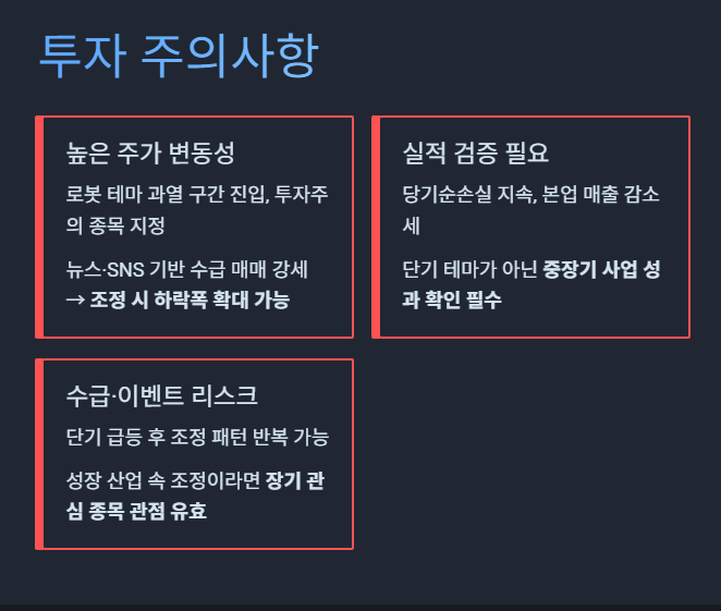 로봇 테마는 결국 글로벌 밸류체인 경쟁이기 때문에, 기술 협력·지분 투자·라이선스 모델이 실적에 반영되기 시작하면 성장 속도가 더 빨라질 수 있다.