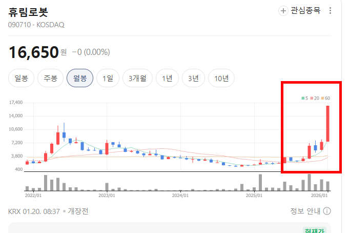 최근 로봇 테마 자체가 과열 구간에 진입하면서 휴림로봇도 단기 급등 흐름을 보였다.