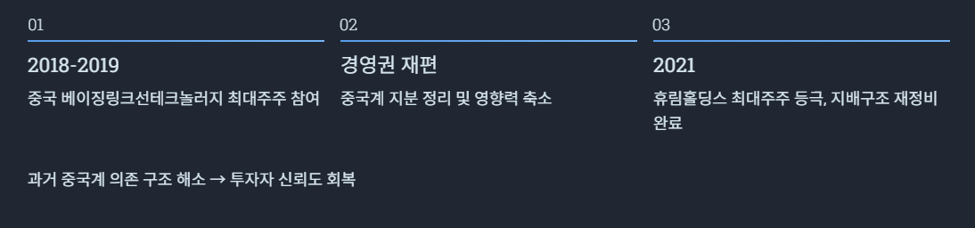 이후 회사는 경영권 매각과 지분 정리를 거쳐 중국계 투자자의 영향력이 점차 축소되었고, 2021년에는 휴림홀딩스가 새로운 최대주주로 올라서면서 사실상 지배구조가 재정비됐다.