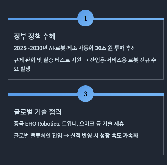 정부는 2025~2030년 기간 동안 AI·로봇·제조 자동화 분야에 약 30조원 규모의 투자를 추진하고 있으며, 규제 완화와 로봇 산업 실증 테스트 지원도 병행될 가능성이 높다. 이는 산업용·서비스용 로봇 모두에 신규 수요가 발생할 수 있는 환경으로, 휴림로봇과 같은 중소 로봇 기업에게는 직접적인 정책 수혜가 기대된다는 분석이 나온다. 특히 정부가 ‘사람 대신 로봇이 일하는 공간’을 현실화하기 위해 제조·물류·공공 영역에 투입을 확대하려는 점이 주목된다.