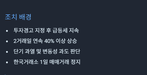 “단기 급등은 확인됐지만, 투자경고 → 매매정지 흐름은 변동성이 매우 큰 구간임을 보여주는 단서”