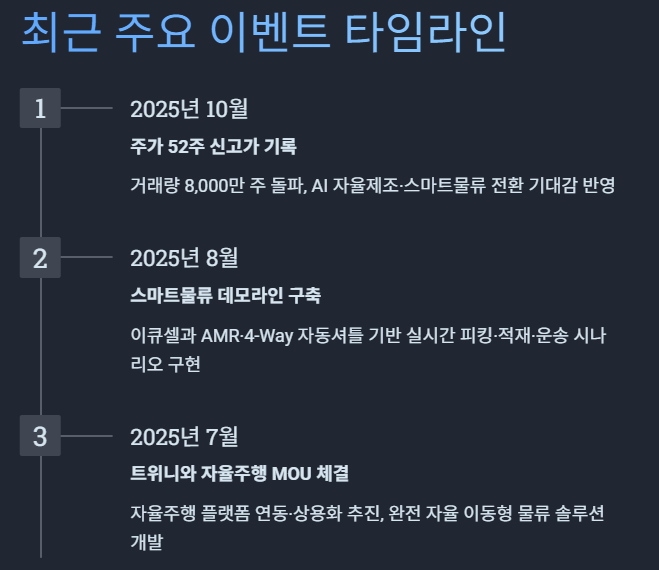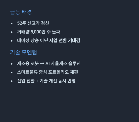 - 2025년 10월 정부 로봇 산업 투자 발표 후 주가 급등 (52주 신고가)